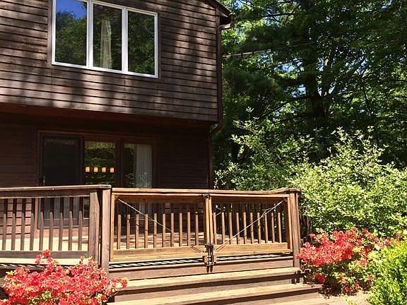 Wonderful property! South Amherst convenience! Nestled on an open private 1.66 acre lot abutting area trails and hiking sits this 4 bedroom 2.5 bath Colonial. Classic wood exterior, Goshen stone, gardens, large deck, garage. Be greeted by a tiled entranceway, large foyer, two living rooms, one with hardwood floors, built-ins, and cozy woodstove; the other with bay window and fireplace, dining room that overlooks the spacious back yard, half bath, and kitchen with cherry cabinets and deck access. Upstairs you will find 4 bedrooms, 2 full baths including master suite with bath. Lower level has finished walk out basement with office/guest room perfect for au pair. Central AC. New roof 2009. 10 minutes to Amherst center. This property has it all! Perfect for entertaining, and enjoying!