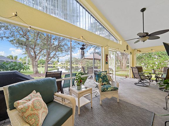 LANAI with Cathedral ceiling and tile floors with mounted TV. 35 ft deep spring fed pond in your backyard to Watch the