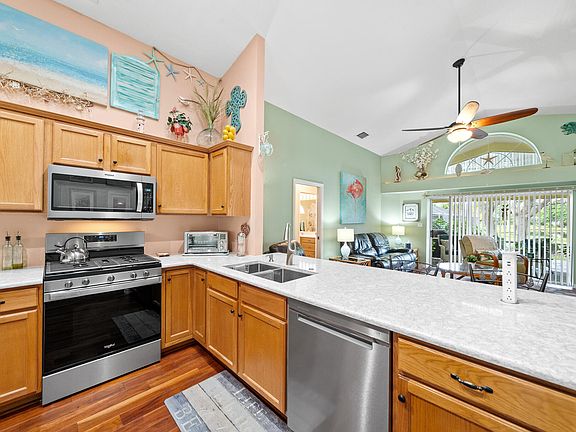 Enjoy SERENE WATER VIEWS of Spring fed natural LAKE in this Meticulously Maintained, Tastefully decorated home in GATED community! Over $58,000 in Updates: 2023 ROOF, 2021 Trane AC, Luxurious BATH retreat & Paver patio to name a few. Leaded glass door entry welcomes you to Soaring ceilings and Brazilian cherry wood floors. . Light, bright, spacious Kitchen offers CAMBRIA Quartz counters & breakfast bar with electric USB port that raises out of the counter, & is OPEN to Great Room with 50 ft ceiling fan & pocket sliding doors, extending your entertaining space to screened lanai. Exit door with window adds light to the laundry room just off the fenced side yard with 3 gates for easy access. 2 car garage with metal pull down stairs for attic storage also houses hurricane shutters, gas water heater, workbench & storage shelves. GREAT LOCATION in the Falls@Sheridan with low annual HOA, Playground & Community events, close to shopping, schools, Viera and 9 miles from the Beach! CALL TODAY Light, bright, spacious Kitchen is the HUB of the home and