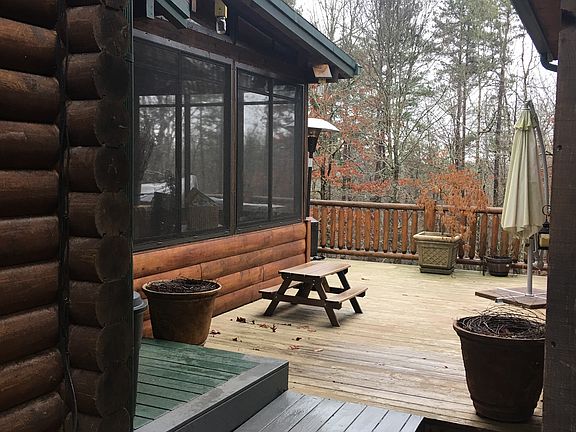 Beautiful log home and 2.5 car garage with private asphalt drive. Koi pond with waterfall in front. Fenced in back yard with upgraded enclosed outdoor patio. Acreage listed is not correct- it's actually a little over 2.4 acres.