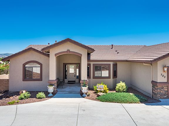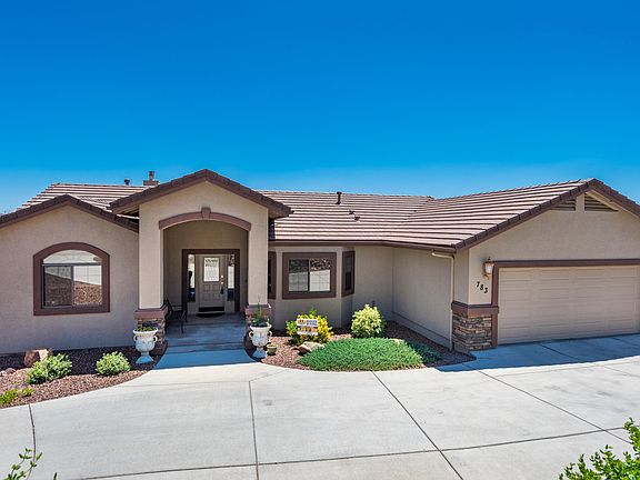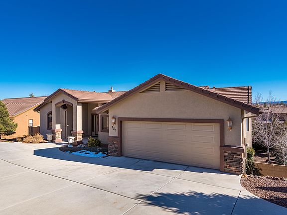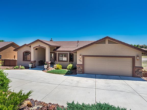 Custom home on great view lot in Pinon Oaks. Upgrades throughout! Home boasts fantastic floor plan with live on one level, level entry, also with family room, bedrooms and bathroom downstairs (in law suite or teenagers?). 5 bedrooms total, +den/office. Shows like a model, well taken care of. Master bedroom has dual sinks and jacuzzi tub! Enjoy the views of the Dells from your deck! Granite counters and newer tasteful flooring. Potential for additional garage (toys), easy lot access. To die for walk in and clean storage!