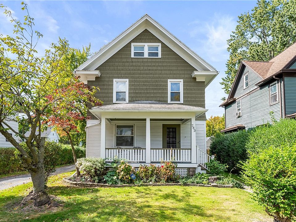 Welcome to the timeless elegance of this 1920s classic Foursquare in Rochester’s sought-after 19th Ward! This home is brimming with charm and updated for modern living, offering a perfect blend of historic craftsmanship and contemporary comfort. Step inside to discover gorgeous natural woodwork, gleaming hardwood floors, and vintage details like French doors, leaded glass windows, and a custom window in the formal dining room. The spacious living room flows seamlessly for entertaining or quiet evenings at home. The chef-inspired kitchen is a showstopper, featuring a butler’s pantry, breakfast bar, concrete countertops, stainless steel appliances, and subway tile backsplash. Upstairs, you’ll find three generous bedrooms and a sun-filled sleeping porch, perfect for morning coffee or evening relaxation. The professionally finished 3 room attic expands your living options, creating a versatile space ideal as a 4th/5th bedroom, home office, studio, or bonus room. Modern comforts include central air, a Lennox high-efficiency furnace (2019), and newer vinyl windows - giving peace of mind for years to come. THIS IS FOR COMPARABLE USE ONLY.