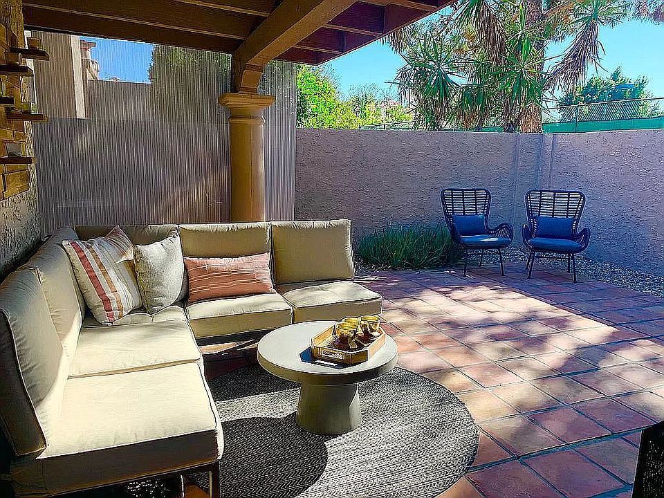 Immediately and Rarely available 2 bedroom, 2 bath with a den/sleeper sofa in prime location of popular Suntree! (ONE OR TWO MONTH LEASE AVAILABLE)This South Scottsdale well cared for home backs up to a quiet community green space. No neighbors behind you. Fully remodeled kitchen in 2019, new windows and exterior doors, high beamed ceilings, fireplace , skylights throughout and a fabulous backyard space to view sunsets and take a peak at Camelback Mountain. Suntree has a beautiful pool and spa and also a tennis court just around the corner. *Minutes to everything Scottsdale has to offer! *Camelback views *Spacious light filled interiors *Cozy designer furnishings *Private outdoor veranda with sun and shade *Resort like comfort *Perfectly equipped with everything you need * 4 Bikes & helmets * Tennis & Pickle ball rackets *Luxurious towels & linens *Fully equipped kitchen * Home office with High speed Wi-Fi and printer *1 King size bed, 1 Queen , 1 Queen sleeper sofa *Silverado Golf course access *located along 30 mile bike trail Landlord to pay HOA dues and utilities. 1-2 month rental available.