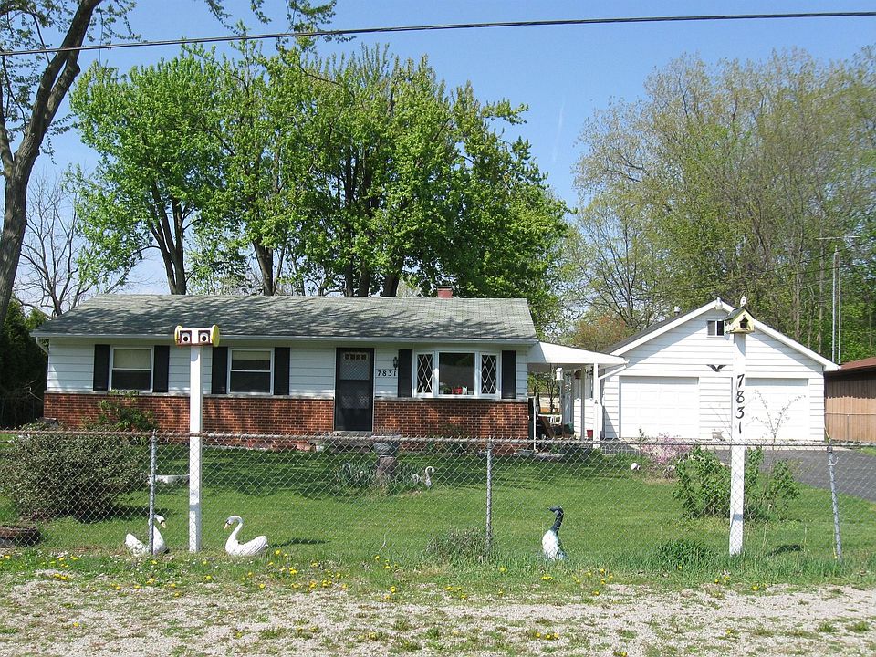 Cute 3 brm ranch on beautiful treed lot with loads of spring plantings. Home offers living room with bay window, roomy kitchen, three bedrooms and large utility room. Covered patio on side of home, 2 car detached garage with stairs to second story, fenced yard plus two sheds. Great buy for $99,900.