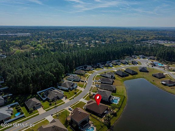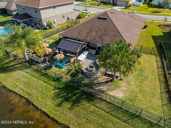 Welcome to this captivating waterfront brick ranch, meticulously crafted by Adams Homes in 2017. Boasting 4 bedrooms and 2 full bathrooms, designed with an open concept in mind that features high ceilings, creating an expansive and welcoming atmosphere. Large kitchen features solid surface counters and dark wood cabinets with bright views of the breathtaking waterfront oasis. The backyard is an entertainer's delight, complete with a charming pergola, patio, cabinets and is perfect for soaking in the tranquil views. A firepit in addition to the screened lanai offers bug free or open air options to enjoy the views. The owner installed the well anchored pergola last year and it serves as an outdoor dining space. Experience the blend of luxury and nature in this exquisite home, offering the ideal setting for both relaxation and gatherings. Lumber Creek is minutes away from brand new Publix, I95, UF Medical and features a pool/clubhouse and park area. No CDD