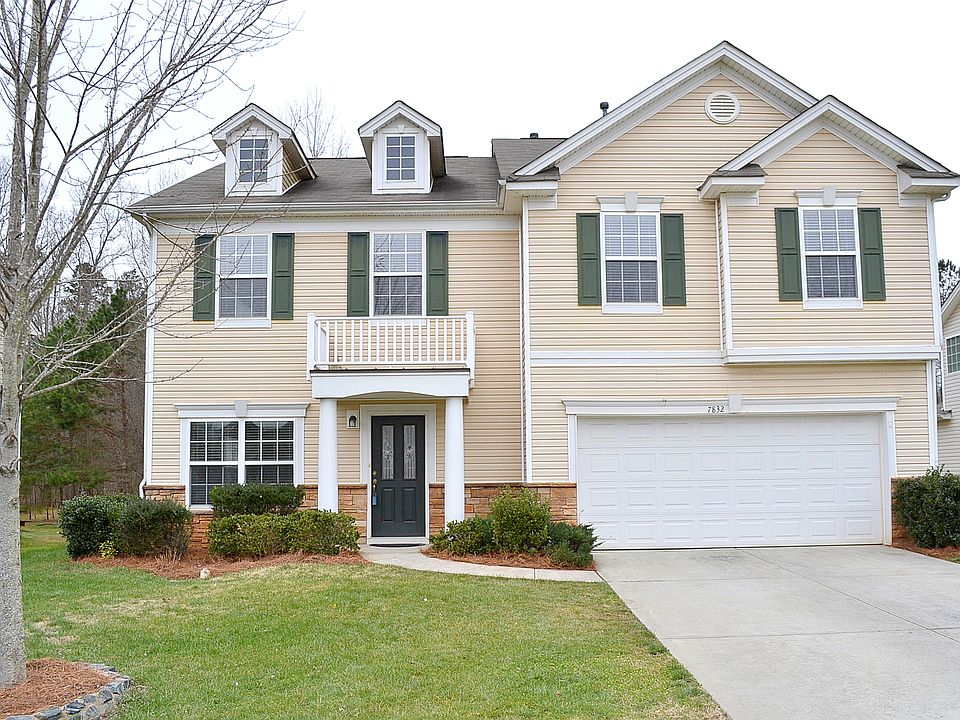 Oversized 3-bedroom floorplan maximizes family spaces. Cul-de-sac lot w large flat lawn that backs to trees w private covered back porch. Interior w open layout, natural light, big upstairs loft, large secondary bedrooms, gas fireplace. Open kitchen w granite counters, double wall oven, cooktop, pantry, refrigerator, microwave, recessed lighting. Master suite has WIC, garden tub & shower, dual vanity. Attractive dormers & covered front entry. Low Mint Hill taxes, well maintained, move-in ready.