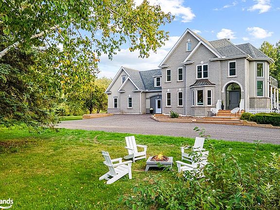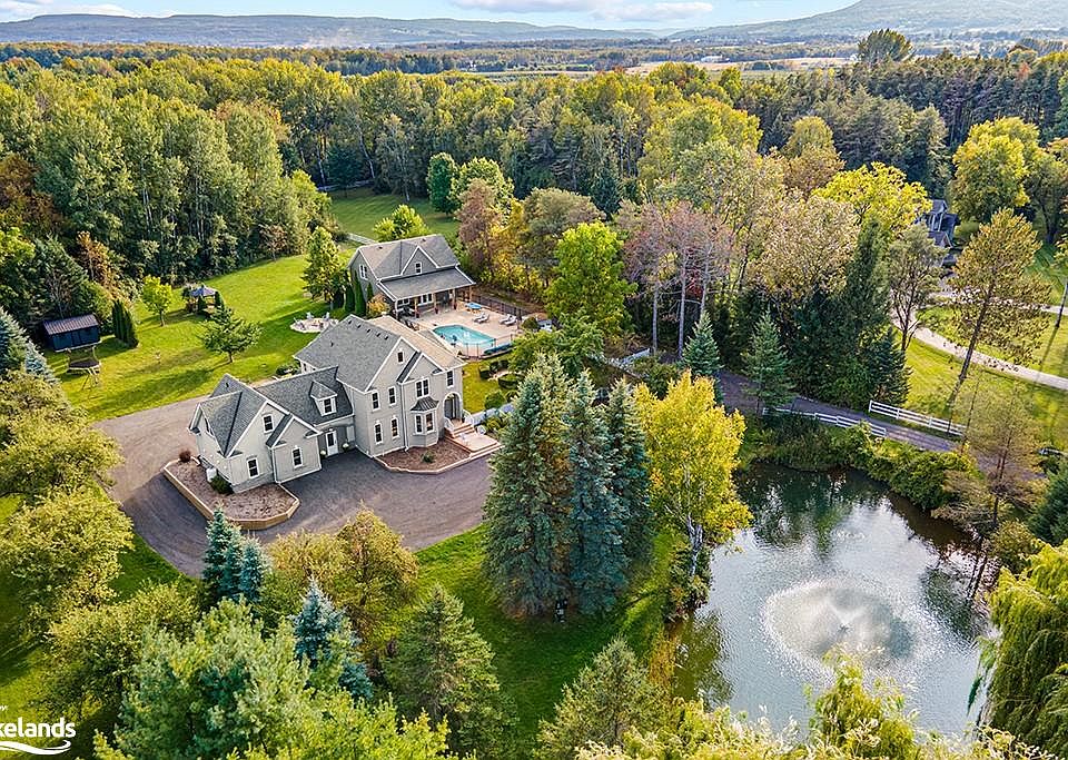 Unbelievable! Welcome to an extraordinary private estate just minutes from downtown Collingwood, the ski hills, and everything the area has to offer. This 15-acre property features a stunning mansion, pool, picturesque ponds, and a brand-new pool-house. The interior of the home has been completely updated and offers three fireplaces and an ensuite in every bedroom for ultimate comfort. The property is brimming with features, and for a detailed list, please refer to the documents. In 2023, a solar panel inverter was installed in the home, along with a retrofit converter that offers monthly income potential. With ample space, you can consider adding a tennis or pickleball court to complement the existing amenities. This estate is ideal for a family retreat or for those with a creative vision. Properties of this quality and location are a rare find. Imagine telling your friends about the stunning ski hill and apple orchard views while strolling through the private trails of your new estate. This is not just a property; it's a lifestyle waiting for you to enjoy.
