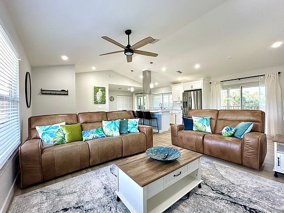 Experience the ultimate Florida lifestyle in this fully furnished 2-bedroom, 2-bath home located in the peaceful community of Alden Pines, Bokeelia, Florida. Perched on a scenic golf course and overlooking a tranquil freshwater pond, this elevated home offers a perfect retreat with all the comforts you need.