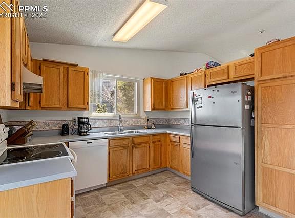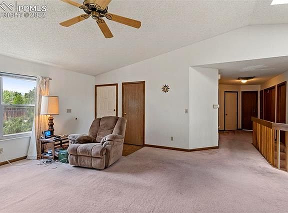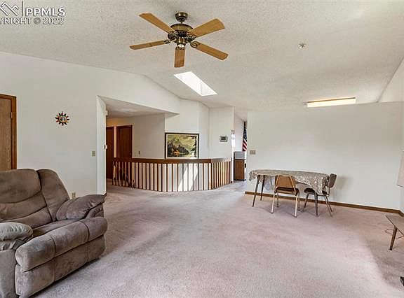 This wonderful home is a rare available find in the area! Sunrise Ridge ranch style floor plan with a fully finished walkout basement! This home is 2760 sf! With 6 bedrooms and 3 bathrooms! The main level features an open, modern floor plan that boasts spacious vaulted ceilings, living room which could easily accommodate a formal dining option. There are 2 skylights, one just off the kitchen and the other in the shared full bath on the main level. The main level primary suite features french door entry, open access vanity, private bath/shower combo, and large walk-in closet. The eat-in kitchen features the walk out to the deck which has been completely redone with composite materials and 6x6 post/piers for extreme durability! All kitchen appliances are included. The finished basement features an enormous rec room/family room with brick gas log fireplace, 3 more bedrooms, one of which includes a walk-in closet which accesses an extra storage room and storage nook under the stairs. Newer carpet in 2 basement bedrooms, and newer laminate at basement landing and hall to bedroom 5. There is also a full bath located just off the utility room. The slider/walkout accesses another concrete patio and leads to the enormous back yard with Double Gate which has enough room to pull an RV in. This home has central air, auto sprinkler, energy efficient vinyl window, gorgeous fragrant lilacs , established shrubs and trees. Plenty of options for gardening, entertaining, and even parking the toys!! The location is minutes away from Powers, with very convenient access to Ft Carson & I-25 as well. Newer roof & gutters 2018, Furnace and AC 2015. Deck 2019.