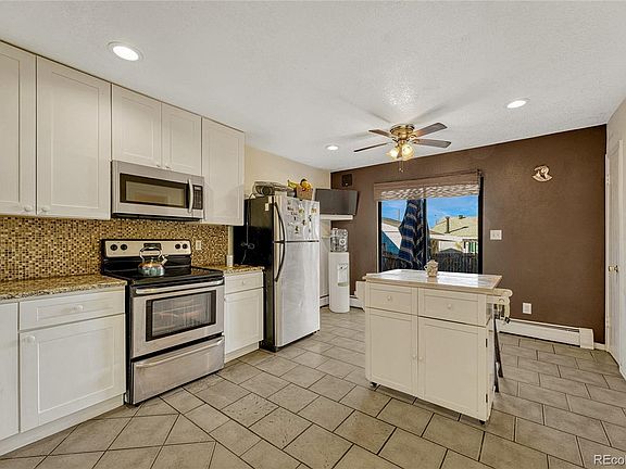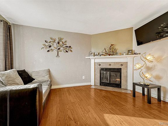 Step inside to discover a spacious living room featuring hardwood-style flooring and a cozy tile fireplace, perfect for warming up during Colorado's chilly winter months. The kitchen is a culinary delight, equipped with stainless steel appliances, a decorative backsplash, and a breakfast bar that encourages casual dining. Natural light floods the interior, highlighting the vaulted ceilings and enhancing the overall ambiance of the home. The primary bedroom provides a serene retreat with ample sunlight and a dedicated heating unit, ensuring comfort year-round.