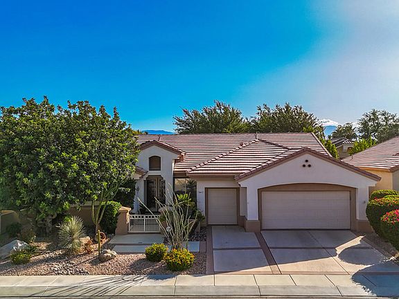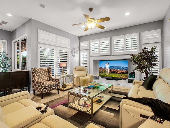 The one that you have been waiting for! Stunning former estate model home, PAVE' model with numerous extras. 3 bedrooms, 2.5 bathrooms, leaded glass French front doors, beautiful diagonally laid etched marble flooring throughout main living area. Living room currently a billiard room with impressive 12 foot vaulted ceilings, Great room with 80'' television included, open granite kitchen with honey walnut cabinets, and granite counters. Newer stainless steel appliances including the washer/dryer. Master bedroom with bay window, and spacious master bathroom and closet not to be believed. Speakers in every room including patio, New Denon amplifier Bluetooth compatible. Plantation shutters throughout, 10 ceiling fans including in the patio that is complete with firepit and 50'' TV. SW facing lush private patio with alumawood patio cover, pebbletec pool and spa with 3 tranquil waterfalls. Epoxy garage flooring, new garage door opener. Home equipped with Central Vacuum..AND...LOCATION LOCATION LOCATION, walk across the street to main clubhouse, pro shop, tennis courts, pickleball courts, fitness center, indoor and outdoor swimming pools, and more AND... 42 solar panels, perfect for desert living. April electric bill was a CREDIT of $472.Most furnishings (like new and contemporary in style) included and available outside of escrow at no cost to buyer.Buyer to pay a one-time new buyer Reserve Replenishment Assessment of approximately 2400.