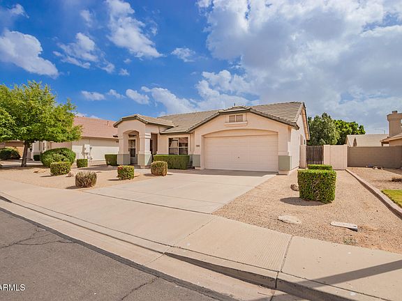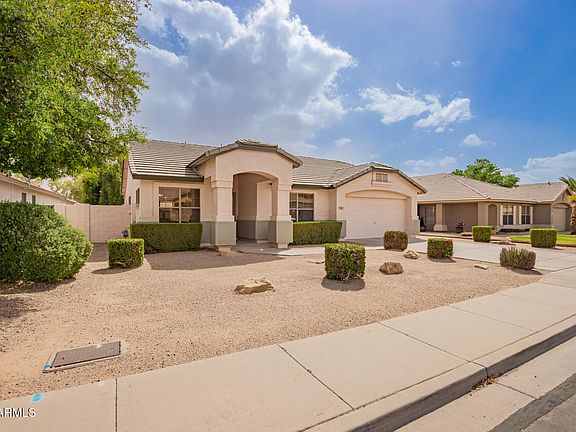 Step into this NEWLY painted 3-bedroom, 2-bath single level home on large lot in beautiful Boulder Creek. NEW roof with 10- year warranty. NEW luxury vinyl plank flooring with 4'' baseboards throughout. Vaulted ceilings, large windows and an open floor plan create an inviting environment with lots of natural light. NEW ceiling fans with LED lighting. The eat-in kitchen features stainless steel appliances, including a NEW oven/cooktop. Large dining area and family room for entertaining. Spacious primary suite offers a walk-in closet, double-sink vanity and spacious tub/shower combo. Secondary bedrooms are generously sized with the washer and dryer conveniently located near them. Outside, enjoy the covered patio and lush grass backyard, with no two-story homes behind for added privacy. Side yard is ideal for outdoor storage. Garage has custom cabinets and an epoxy-coated floor. Additional features include a 50-gallon hot water heater, and water softener. Located near Loop 202 with easy access to US 60, this home is move-in ready!