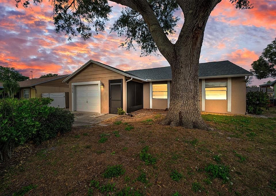 One or more photo(s) has been virtually staged. Welcome to this light and bright 2-bedroom, 2-bath home in Seven Springs featuring an attached 1-car garage and screened front porch. NEW ROOF in 2025. Inside, you’ll find an open floor plan with tile and Luxury Vinyl Planks (LVP) flooring throughout (no carpet), creating a spacious, clean and low maintenance living environment. The dining room opens directly to the living area, creating an easy flow that’s perfect for everyday living and entertaining. The living room features sliding glass doors leading to an enclosed patio room, offering peaceful backyard views and seamless indoor/outdoor living. The spacious kitchen has brand new appliances, ample cabinetry, generous counter space, eat -in area and plenty of natural light. The primary bedroom is generously sized and features sliding doors to the patio room, along with a private ensuite bathroom with a tub/shower combination. A nicely sized guest bedroom and full guest bath provide comfort and flexibility for family or visitors. Enjoy the Florida room overlooking a large backyard complete with a paver patio, ideal for relaxing or entertaining outdoors. A storage shed adds extra functionality. Located in Seven Springs neighborhood which is conveniently close to shopping, restaurants, medical facilities, and top-rated schools, offering comfort, convenience, and a great opportunity to own in a prime location.