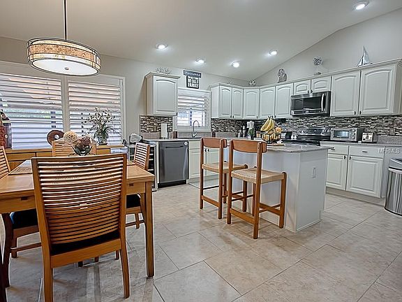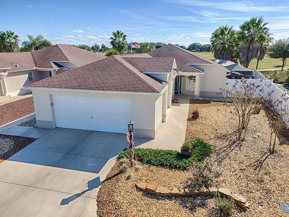 One of the BEST golf and water VIEWS in The Villages. This Custom 3 Bedroom/2 Bath Stoneybrook Courtyard Villa is perfectly positioned on the Havana Championship Golf Course and offers a Lanai with huge expanded outdoor living space with an additional canvas covered birdcage, two retractable awnings and plenty of room for entertaining. Enjoy the peaceful sounds of your own waterfall while relaxing in your spa hot tub. This home has no carpet only tile and laminate throughout along with upgraded lighting. The Kitchen boasts Silk cabinetry, Silestone solid surface countertops, glass tile backsplash, stainless steel appliances, center island and a wall of floor to ceiling Silk cabinetry. A separate Dining Room accommodates a large dining table with glass sliders leading to the outside lanai area. The Living Room has built-in Teak shelves and cabinets, decorative fireplace and large privacy window to view the backyard golf course and water. Just imagine waking up to the panoramic view from your master bedroom which has a large privacy window facing the view of the golf course and water. The master bath has Silestone on the vanity, frameless glass and tile shower. The 2nd bedroom has a built-in closet and 3rd bedroom has a built-in wall bed and cabinet. Both bedrooms are serviced by a newly designed hall bath with frameless glass doors, decorative tile surround and Silestone on the vanity. Plantation Shutters, Two car oversized garage and BOND PAID. MANY MORE FEATURES - CALL FOR YOUR PRIVATE SHOWING.