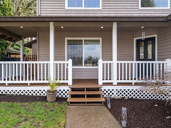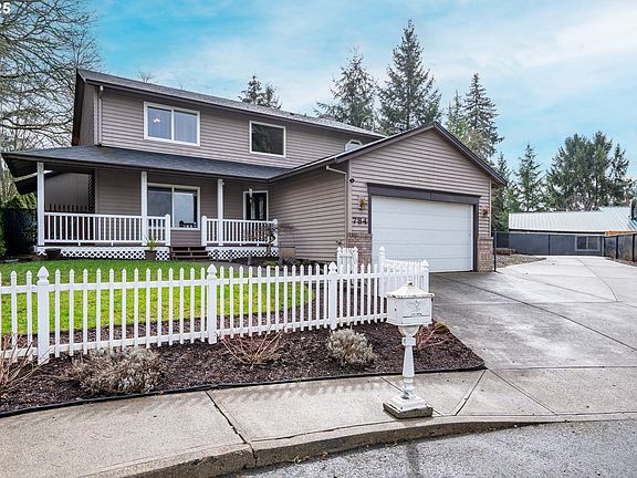 Welcome to your picturesque Estacada retreat! Tucked at the end of a quiet cul-de-sac, this charming 90s contemporary home exudes curb appeal with its white picket fence, a two-car garage, and an extra-large driveway ready for an RV. The inviting wraparound front porch is rocking-chair ready! Inside, the formal dining room seamlessly flows into the chef-inspired kitchen, featuring generous storage, stainless steel appliances, and a sizable kitchen island ideal for entertaining. The adjoining family room boasts bright windows and a cozy stove, offering a warm and welcoming space. Sliding glass doors lead to your private, peaceful backyard. A first-floor laundry room offers a utility sink, folding counter, and plenty of storage for supplies, plus a half bath for convenience. Upstairs, the expansive primary bedroom offers vaulted ceilings, stunning west-facing views of the rolling hills, and spacious walk-in closet. The luxurious primary bath features a large soaking tub, walk-in shower, and a double-sink vanity. Three additional bedrooms and an additional full bath round out the second level. Step outside into the beautifully landscaped backyard, a .20-acre fully fenced oasis. The large covered patio is perfect for creating your outdoor kitchen or entertaining space. A serene water feature, complete with cheerful frogs, adds a calming touch. With south-facing raised garden beds, you’ll be ready to grow your own fruits and veggies all summer long!