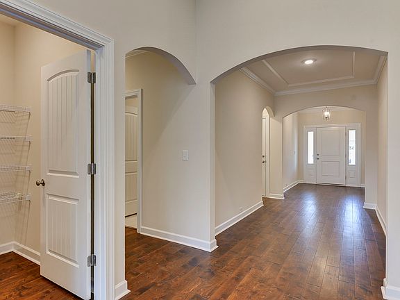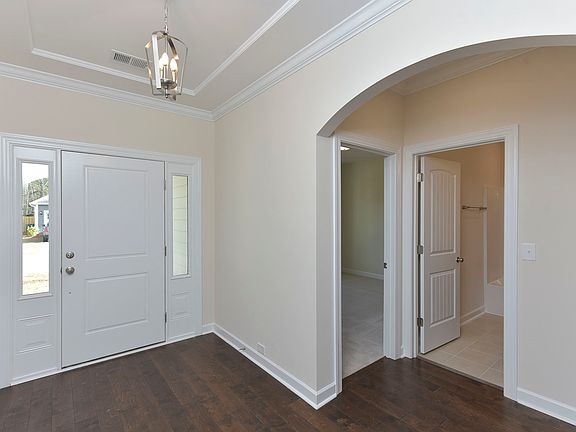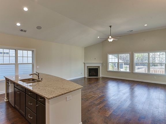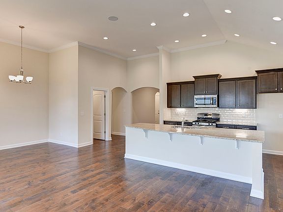 Enjoy one level living in this Edgewood plan featuring three bedrooms and two baths! Beautiful five-inch hand scraped hardwood floors and arched openings welcome you and extend throughout the main living areas including the open island kitchen, spacious eat-in area, and family room. The kitchen and family room have twelve-foot ceilings and the master bedroom has a boxed ceiling. The family room opens to a covered porch for relaxed outdoor living and the master bath includes a 48" x 60" tile shower! The kitchen has beautiful stained cabinets with upgraded construction and stainless appliances including a gas range. All countertops are granite and flooring in both bathrooms and the laundry room is ceramic tile. Window blinds are included. MLS# 475721