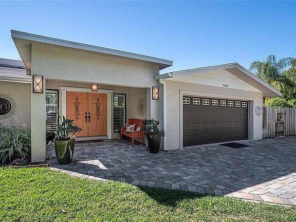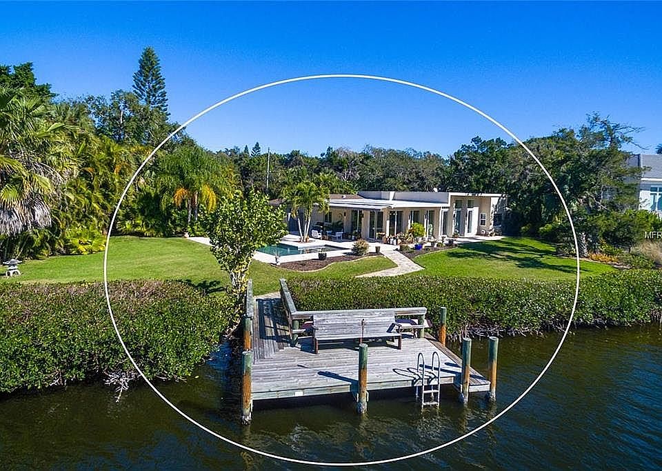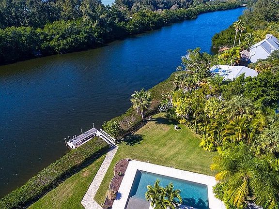 Nestled inconspicuously on 137 feet of Siesta Key's magical Heron Lagoon, minutes from south Siesta Key Village shops and restaurants, with easy on and off over the Stickney Point bridge, this reimagined Key home is an oasis. Quiet water activities and wildlife set the tempo for your lifestyle. The open entry with full view to water, flows into the living, dining and cook's kitchen floor plan, all with serene water views. Sleek and modern, yet warm and inviting, vaulted ceilings and tall glass sliders fill the living areas with natural light and nature. The kitchen is outfitted with high end appliances including full house water filtration system all planned by dedicated culinary mavens. 24"X24" polished porcelain tile throughout adds reflective light and casual elegance. A bright master bedroom suite opens to a charming garden room overlooking the lagoon and lush tropical landscape. The guest suite and additional flexible room serving as a guest, studio or bonus area complete the picture for life on the key. The fenced yard features a chic saltwater pool with sunning shelf, patio, and lawn with lush tropical plantings. Walk out on the dock past the kayak storage dock with your coffee or wine and sit on the bench to enjoy the early morning peace or spectacular sunsets.