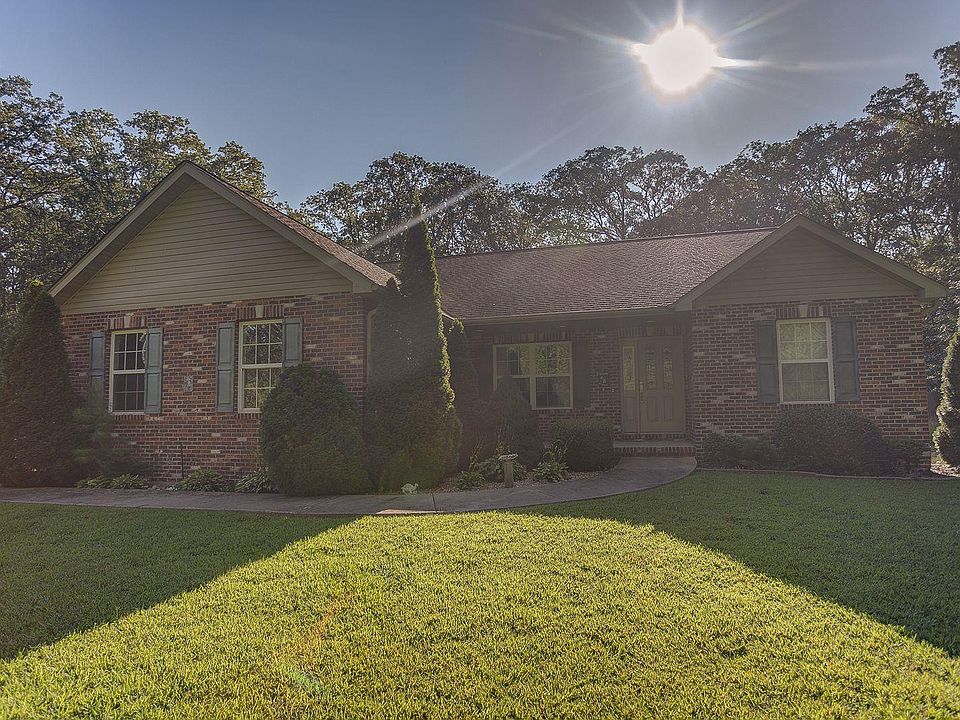 Luxury living at its finest in this peaceful setting of 5 wooded acres. Custom built 1,530 sq. ft. brick ranch home w/ full finished basement. Foyer welcomes you to a Great Room w/fireplace & vaulted ceiling that opens to the dining room and kitchen. Kitchen features a gas range, refrigerator, dishwasher, microwave, and pantry. Breakfast area leads to the covered back porch with a view of the lovely flower garden. Large master suite, w/walk in closet and bath with a walk in shower and double vanity. Two additional bedrooms along with a guest bath and Laundry room w/storage are all located on the first level. Lower level features a large family room, full bath, and office. Oversized 2 car garage. Additional 5 acre wooded parcel available. 30 minutes to Scott AFB, 10 minutes to I-64 Exit 41
