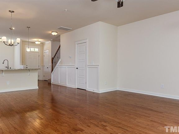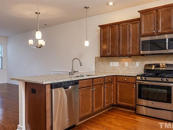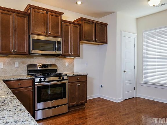 Like new & nothing to do but move right in! Kit w/ SS gas range, granite, tile back splash, breakfast bar & pantry. Entire 1st fl hardwoods. Glass sliding door leads to private back patio, fenced yard & attached storage. MBR on 2nd floor with cathedral ceiling. MBA has 5' tiled shower and double vanity. Second BR has it's own full bath. Upgraded carpet on stairs and 2nd floor. Energy efficient spray foam insulation is great for cost and noise reduction. Perfect location between Ral & Brier Creek!