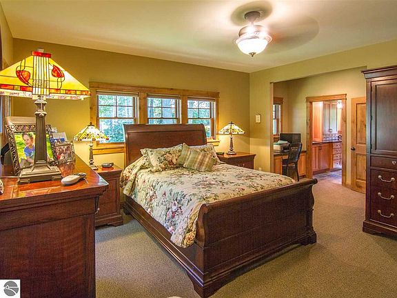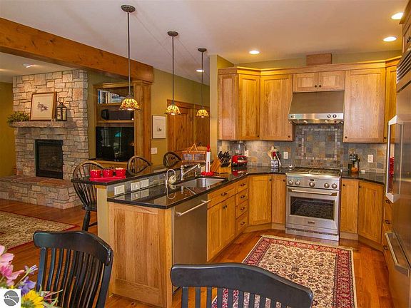 FOR SALE AS OF 7-15-17 - 5 bedroom, 3 full and 2 half baths home overlooking 8th fairway of Crystal Mountain’s Mountain Ridge Golf Course in beautiful northern Michigan. This home offers a master bedroom/bath complete with heated bathroom floor, Homer wood hickory floors, hickory cabinets, custom milled Alder doors and trim with Baldwin hardware, finished lower level with crown molding, gourmet kitchen with granite countertops, GE Monogram appliances and Asko dishwasher, hot/cold water dispenser. The family room has upgraded Heat ‘n Glow fireplace with variable speed blower, light and fan, and French doors leading to four seasons room with corner Heat ‘n Glow gas stove. This home has a high efficiency dual fuel zoned heating system with a whole house dehumidifier and water softener. Home is also prepped for generator. The exterior has brick paver driveway, patios and walkways complete with water feature and fire pit. Covered porch with ceiling fans and wired for speakers. Full sprinkler system with drip system for gardens and flower pots with built-in fertilization tanks and rain sensor. Garage has stairs leading to full storage area.