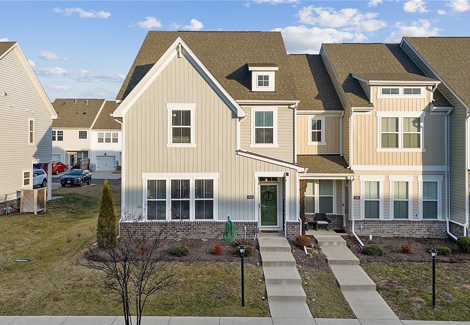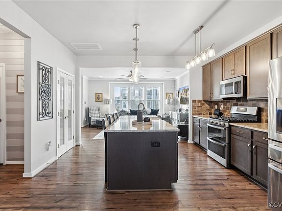 Welcome to 7841 Old Guild Road in the Silverleaf community of North Chesterfield. This beautiful, MOVE-IN-READY end-unit townhome offers 1,871 square feet of space, featuring 3 bedrooms and 2.5 bathrooms. Built in 2021, the home is equipped with modern amenities and maximum upgrades. The first floor includes an open-concept living area with 9-foot ceilings and luxury hardwood plank flooring throughout the dining room, kitchen, and living room. The gourmet kitchen boasts granite countertops, stainless steel appliances, a large island with a breakfast bar, farmhouse sink, pantry, and recessed and pendant lighting. It overlooks the dining and living areas, making it perfect for entertaining. The powder room is conveniently located next to the mudroom, offering easy access to the interior garage entrance. The living room is pre-wired for a surround sound system, allowing for easy installation of your receiver. The upper level is beautifully carpeted and features an owner's suite with a tray ceiling, a walk-in closet, and an en-suite bath, including a dual vanity and a tiled shower. Additionally, this floor includes another full bathroom, two spacious bedrooms with ample closet space and ceiling fans, and a laundry room with shelving. Other notable features include a one-car attached garage, a concrete driveway, vinyl siding, and windows, a natural gas stove, electric heat and hot water, and central air conditioning. The rear of the home features a quiet concrete patio, perfect for enjoying peaceful evenings.