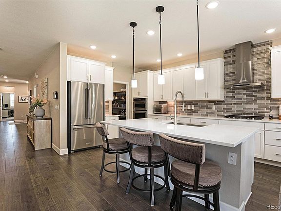 Must see stunning CalAtlantic ranch floorplan with custom basement finish. This is an entertainer's dream featuring a kitchen loaded with upgrades, extended multi-level patios for mixed outdoor seating, plus a lux bar with media room in the basement. Washed main level wood floors, custom window coverings, and recent updates throughout. 5 beautifully finished bathrooms with quartz, floor-to-ceiling tile, oversized showers, soaking tub, more. Don't miss the large primary suite that walks out to a covered patio, including a dramatic 5 piece spa bathroom, large walk-in closet, and pass through to the remodeled main level laundry room. The custom basement will wow with a full bar, media room, custom bathroom, 2 more bedrooms, and thoughtfully designed with extra storage throughout. Finished oversize 3 car garage including one bay 23+ feet deep for larger vehicles. Located across from the Overlook Rec Center and pool, walk your dog along the extensive trail system, take a stroll or drive to coffee, Brewery, banking, health care facility, all within Sterling Ranch. Minutes to Chatfield State Park, Waterton Canyon, Denver Botanic Gardens at Chatfield, shopping/restaurants, more! This home is better than new, call to schedule your private showing!