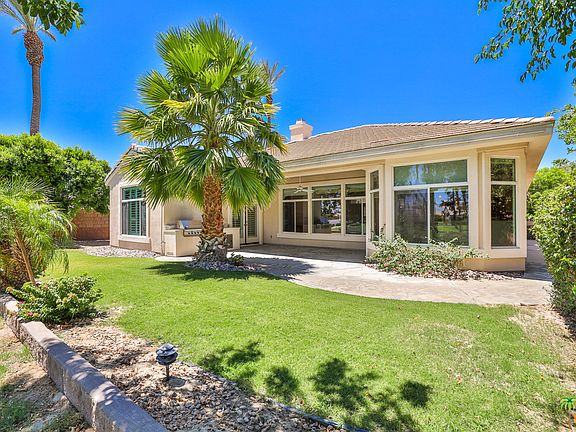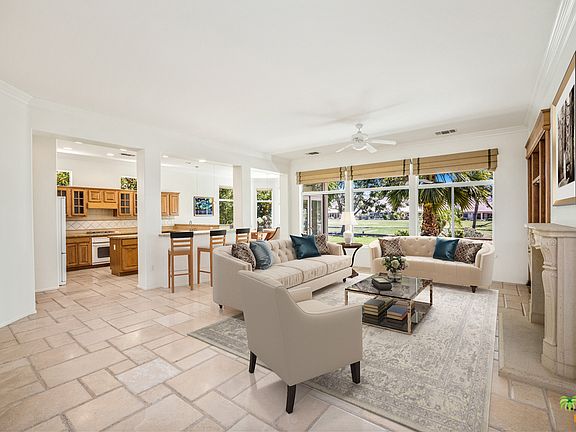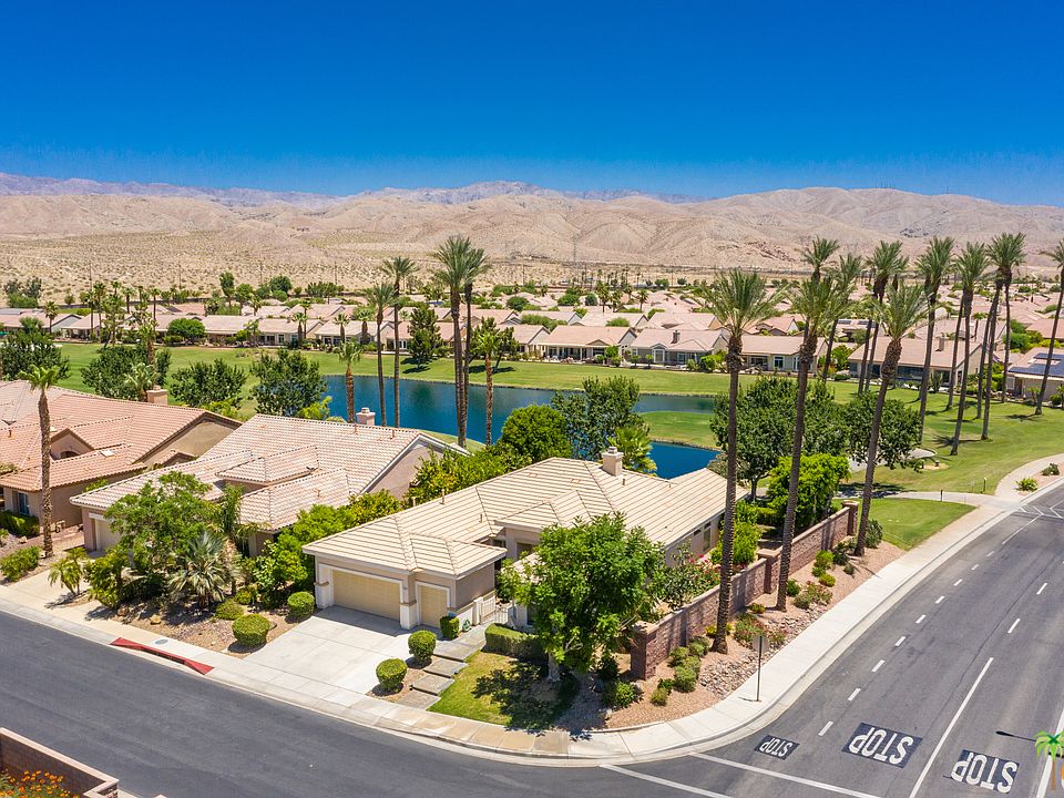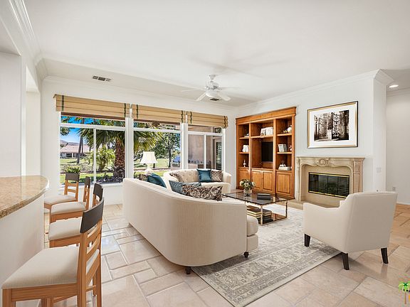 This is a very attractive, spacious home in the highly desirable Sun City community, with beautiful views facing the golf course, lake and mountains. Open plan living at its finest, with stone tile floors throughout, a large entry and living area with fireplace and high-end wooden built-ins, large kitchen with granite countertops and a center island opening up to the breakfast/dining area with bay windows. Two large master bedrooms, each with an en-suite bathroom, and one also has a large dressing room. Additionally, there is a lovely den with wooden built-ins, which could also be converted into a third bedroom. There is a small office and half bathroom to the rear of the kitchen. Large double garage with room for a golf cart. The large covered patio facing the golf course, lake and mountains has a built-in barbecue - great for entertaining!
