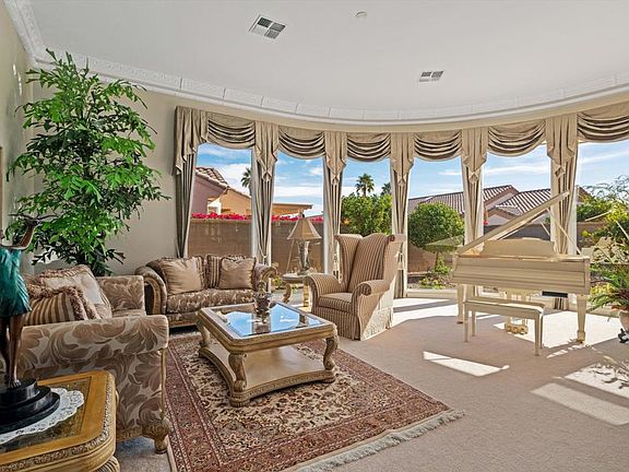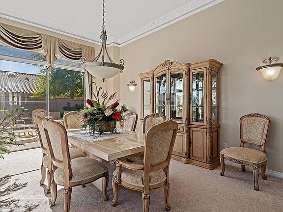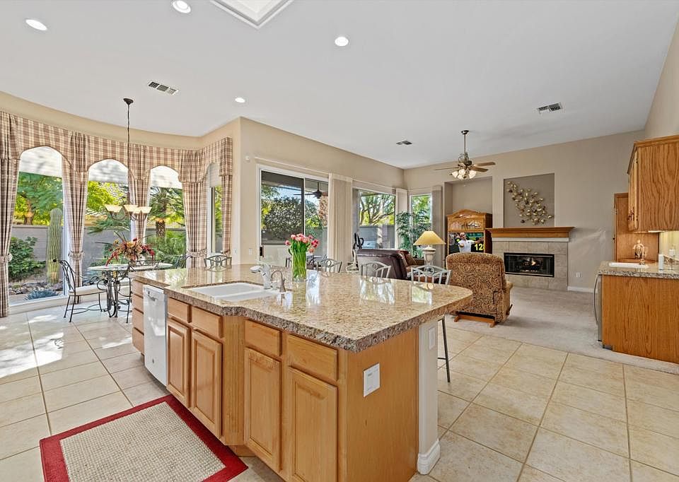 Seller motivated. Welcome to this spacious Provence model in Sun City Palm Desert. Private entryway with stamped concrete. The interior features soaring ceilings capturing wonderful natural light for this south facing residence. Equipped with many wonderful bells and whistles including custom motorized shades in great room/dining area, crown molding features with rope lighting to create the ideal ambience, the 2 A/C units are roughly 2 years new with smart thermostats, plus a central vacuum system. Large kitchen with island counter plus breakfast nook all opening to the large family room with fireplace and wet bar. 2 deluxe bedrooms plus den/office. Spacious master bathroom with large walk in shower and separate tub. The guest suite on opposite side enjoys it own en-suite bathroom. The back patio is ideal for those gatherings and BBQ's with family and friends. Exterior paint nearly 2 years new. Upgraded pebble paved patio with retractable awning, sun shades, low maintenance landscaping, smart irrigation with assorted citrus trees. The 2 car plus golf cart garage has an Epoxy finish with storage cabinets. Just a short stroll to one of the 3 clubhouses with fabulous amenities including pool, spa and lighted bocce courts. A wonderful place to call home!