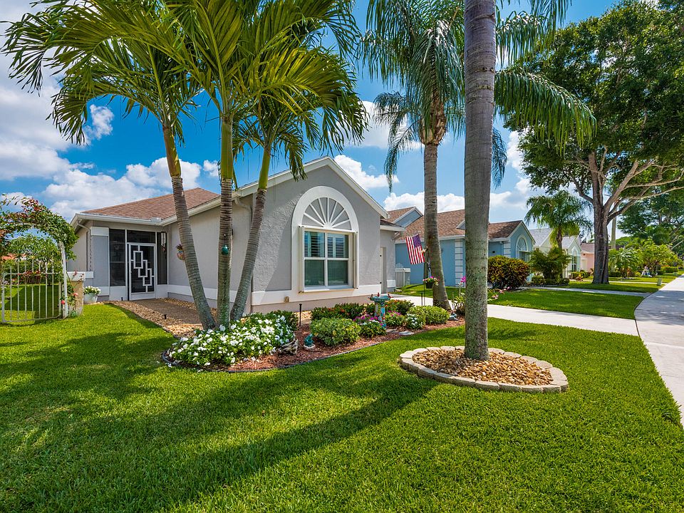 Fall in Love with this truly impeccable, pristine single family home located at Pine Ridge's desirable 55+ community in Delray Beach. Fully updated with quality renovations throughout this elegant 2 bedroom, 2 bath home with a family room, Florida room and garage. Gorgeous solid cherry wood kitchen with soft close cabinets, pull out draws with dove tail joints, granite countertops, stone tile floor, subway glass tile backsplash, newer SS GE profile appliances, double oven and Bosch dishwasher. The custom kitchen ceiling is Smith & DeShields tongue and groove solid wood along with the crown molding. Both baths have been fully renovated, porcelain tile floors, beautiful glazed wall tile and stone mosaic floors in the showers, custom shower doors, primary bath countertop is quartzite natur- al stone. The column tops in the family room are also quartzite. Stunning hand scraped laminate wood flooring in the main living areas. The home has brand new plumbing (just repiped). Plantation shutters on all windows and slider with wrapped window sill frames and molding. All windows have been replaced with double pane glass and hurricane strength frames along with the slider plus full Accordion shutters. Newer hurricane garage door and opener. New primary bedroom closet doors with custom closet built ins. Newer Florida screened room off the back of the home with hurricane strength framing up to 170 mph. The AC system has a Reme Halo purification and a secondary pump for overflow protection. Pride of ownership in this home! The Community offers a Clubhouse, 2 heated pools, Spa-hot tubs, Tennis, pickleball, shuffleboard, bingo, yoga. Low HOA fee covers exterior house painting every 8 years, Lawn care, pressure washing of driveways and walkways once a year, common areas, exterior pest and weed control, basic cable and internet, ADT basic security, trimming of trees front property if original from the builder once a year prior to hurricane season. Great location in a booming area close to Delray Marketplace, Josephs Market, shopping, dining, movies, downtown Delray, the beach and the Florida turnpike.