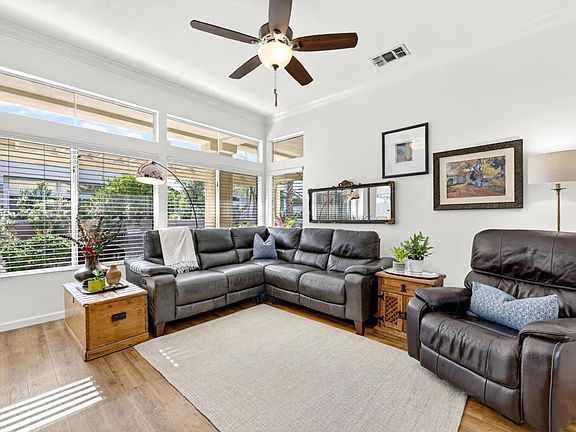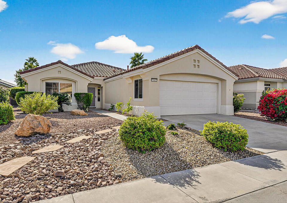 Discover a standout home in the heart of Sun City Palm Desert, where comfort meets sophistication in this beautifully updated Gorham floor plan with owned SOLAR. With 1,157 square feet (EST.) of thoughtfully designed living space, this residence shines with quality upgrades, timeless finishes, and an exceptional southern exposure that fills the home with natural light. From the moment you step inside, you'll feel the pride of ownership. The living area is warm and inviting, enhanced by luxury vinyl plank flooring throughout, newer interior paint, and elegant crown molding that adds a refined, custom touch. The kitchen is equally impressive, featuring stainless steel appliances, crisp white counters, rich cabinetry and a kitchen skylight--creating a space that's both functional and beautifully styled. The primary suite offers a serene retreat with generous proportions and an en suite bath, while the guest bedroom and full bath provide comfort and privacy for your visitors. Every space feels fresh, bright, and cared for. Step outside to your private covered patio surrounded by lush landscaping--an ideal spot to unwind, entertain, or simply enjoy the quiet beauty of the desert. Even the garage has been elevated, boasting upgraded epoxy flooring that adds durability and a clean, polished finish rarely seen at this price point. Beyond the home itself, Sun City Palm Desert offers an unmatched lifestyle with two championship golf courses, three clubhouses, sparkling pools and spas, fitness centers, pickleball and tennis courts, restaurants, and a vibrant calendar of social clubs and activities. Beautifully appointed, impeccably maintained, and move-in ready--this home stands out as one of the best values and finest offerings in Sun City Palm Desert. Don't miss your chance to make it yours!