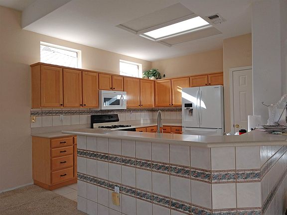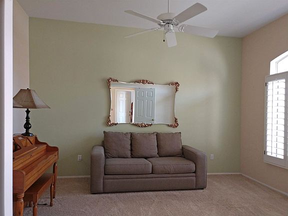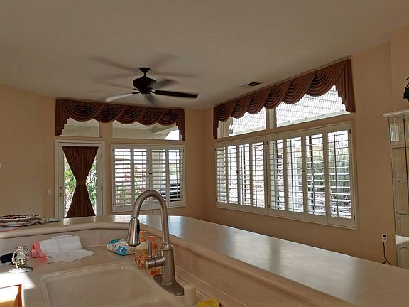 Sneak Peek before staging and professional photos!This lovely open-concept Towle model is super bright with 3 skylights, and the high ceilings make it feel so much larger. The kitchen is open to the dining and living rooms and has a skylight and Corian counters. There are plantation shutters throughout for that tropical vacation feel. The fabulous master suite has a picture window out to the backyard and the bathroom has a walk-in shower, walk-in closet, and a separate toilet room. The guest room/den has double doors and a closet could be added to make it a 2 bedroom home. Laundry is conveniently located inside the home. The 2 car garage is attached and has lots of custom storage cabinets and a newer HVAC system. The large backyard faces south and has an extended patio, an Alumawood cover, fruit trees, and enough room for a pool or just relaxing and sunning. The driveway and entry concrete has a special epoxy overlay for that classy curb appeal. The seller is willing to credit the buyer 5,000.00 toward flooring and paint. This home will not last long, so come and see it soon.