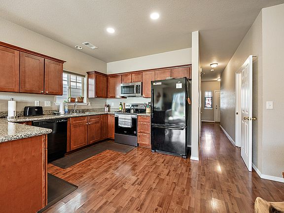 Thoughtfully designed, two story townhome close to library, walking paths, schools and shopping. Sellers offering up to $3,000 for buyer rate buy down and/or loan costs! Open concept main floor includes half bath, updated kitchen opening to great room and sliding glass door to a private patio with garden beds and room to relax. Nicely sized kitchen features granite counters as well as new electric stove, microwave, dishwasher and updated lighting. Upstairs you will appreciate the layout of two guest bedrooms, full guest bathroom and primary suite with two walk-in closets and an ensuite bathroom with dual sinks and large shower. Also located upstairs is an oversized linen closet and laundry closet with washer and dryer included in sale! HVAC system was updated in 2017. The single car garage includes sturdy storage shelving and garage door opener. Monthly HOA covers water, sewer, front landscaping and more. This well maintained townhome has generous storage space and is move in ready!