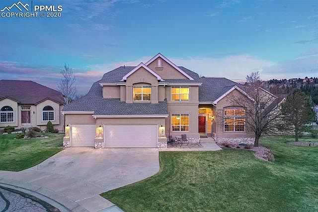 Stunning 2 story home available in desirable Peregrine! Impeccably maintained inside & out this elegant property is ready for you to move right in. Located on a cul-de-sac, you'll enjoy beautiful mountain views & rock formations from both the front & back of your home. Walk into this warm & inviting home and you'll notice the beautifully refinished hardwood floors in the hallway, dining room & office. The open family room boasts vaulted ceilings, new carpet, cozy gas fireplace and plenty of windows to let in sunlight. Charming butler pantry located off the dining room and convenient hallway desk nook are just some of the small touches that set this home apart. spacious main level master bedroom boasts a completely remodeled contemporary 5 piece master bathroom and includes new paint, blinds and carpet in the bedroom. The kitchen features newer stainless steel appliances, high end granite and tile backsplash, recently added french doors with screened sidelights in the kitchen and a sizable island. No need to worry about the mechanicals as both furnaces, A/C & water heater were all replaced in 2018. Additional interior upgrades include a basement wet bar, storage room, 5 bedrooms (including main level master) Exterior features include newer exterior paint (2017) and new Trex deck, 50 year roof, all newer garage doors & new carriage lights. Located within walking distance to Woodmen Roberts Elementary and easy access to park, tennis courts and hiking trails!