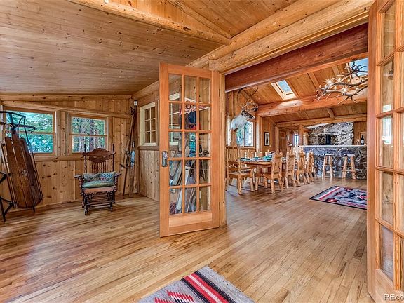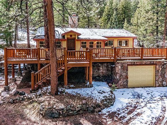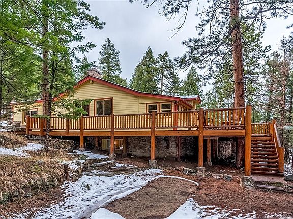 A stunning, 1000+ square foot wrap-around, natural-wood deck on this enlarged mountain cabin, does not prepare you for the amazing full interior make-over awaiting. Even before you enter you will be impressed with how quiet and private this exceptional homesite is. Just ask the plentiful wildlife, including deer and elk, red fox, and wild turkeys that visit frequently. On inside, you will delight in the massive, wide-open engineered log and knotty pine great room with a huge, wood-burning fireplace rivaled only by that of Citizen Kane! The expansive dining area accommodates the entire Thanksgiving guest list and abuts an open, full-featured kitchen with tons of cabinets. The walk-thru pantry then leads you to an amazing, climate-controlled wine cellar. A vaulted Master Suite, complete with its own fireplace, two walk-in closets, and full bath, is also part of the main-level living. Hearty oak floors run throughout the home, along with tile floors in the kitchen and bathrooms. No carpet. Sorry/not sorry. Three more large bedrooms, all with walk-in closets and full, ensuite baths, occupy the lower level. This fabulous Rocky Mountain retreat sits on 3.2 pristine acres, just minutes from Highway 285, and 40 minutes from Downtown Denver. There's a 14x16 attached shed, with power, for any one of multiple uses. This is an easy site for building an additional garage or outbuilding along the big circular driveway. Its zoned A-2 for animals and has a Domestic Well to support horses, other animals, or a nice greenhouse. Too many extras and nuances to list. Ask me about 4 simple upgrades that would take this home even further over the top.