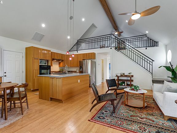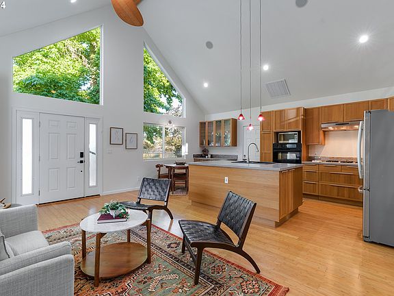 Welcome to this impressive Multnomah Village NW Custom home! This 4 bed + 2 bath + loft oasis boasts an open concept floor plan with a light filled, spacious living room with beautiful bamboo floors, vaulted ceilings with massive windows that go clear up to the roof line. The chef's kitchen is an entertainer’s dream, offering ample cabinetry, a huge island, SS appliances, and an eating area with gorgeous built-ins - perfect for a coffee bar! A custom built railing leads you to an airy loft with vaulted ceilings, doubling as a 2nd living/bonus room. Enjoy the newly renovated hallway bathroom, outfitted with charming penny tile, custom fixtures, and a beautiful vanity. The primary suite offers a large walk-in closet, an ensuite bathroom with a soaking tub, walk-in shower, and French doors leading to a beautiful new composite deck. The expansive fenced backyard is a nature lovers dream! The Backyard Habitat is the perfect, peaceful backdrop for entertaining with its sprawling deck, fire pit, and raised garden beds. RV parking is available on the side of the home. Located a stones throw to Multnomah Village shops, restaurants, Gabriel Park, I5, Burlingame and top rated schools. This special home truly is a must-see!