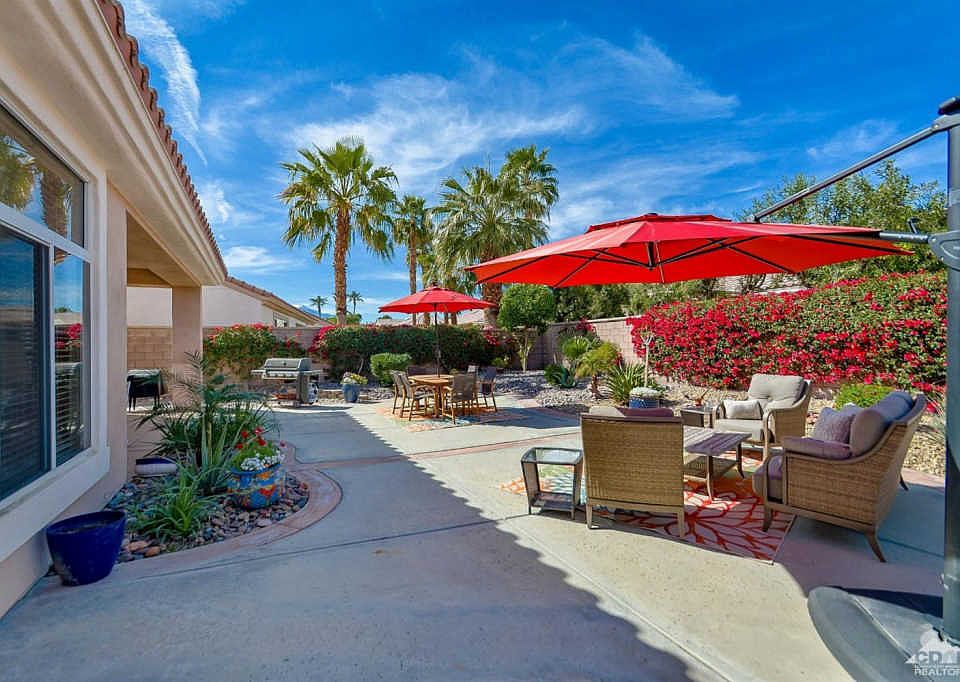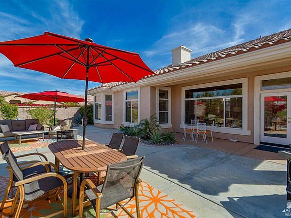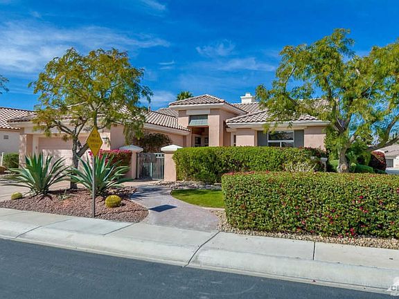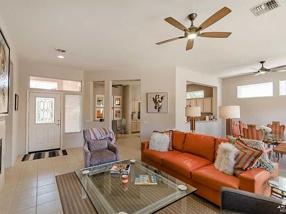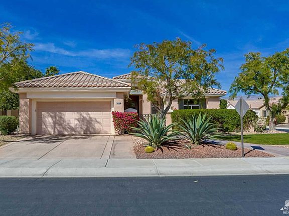 Located on a corner lot, with a front courtyard entry, this beautiful Morocco model offers the ideal desert lifestyle. This 1,766 SF (est.) home has 2 bedrooms, den/office, and 3 baths. Double doors lead into the master suite that has a bay window overlooking the backyard, dual vanities, step in glass shower and a generous walk-in closet. The second bedroom has a private bath. There is a powder room in the hallway. The kitchen and breakfast nook features upscale countertops, center island and stainless steel appliances. The contemporary styling in the great room has soaring ceilings, tile floors, gas fireplace and a media niche. The home comes complete with high-end lighted ceiling fans, designer paint and upgraded carpet in the bedrooms. The private low-maintenance backyard is a perfect outdoor escape with an extended patio and well-manicured landscaping. The 2-car garage has space for a golf cart. Act fast while this gem of a home is still on the market!