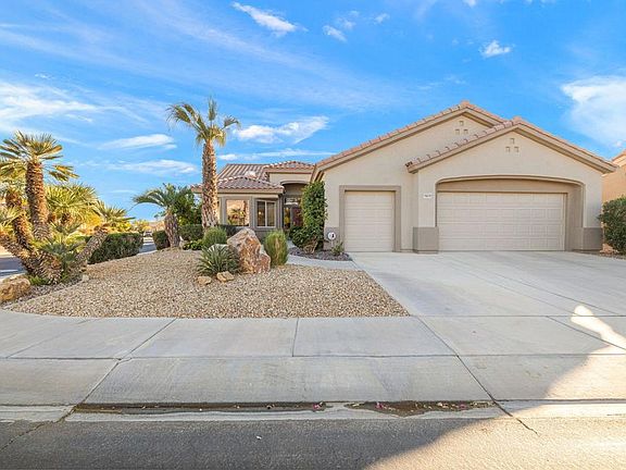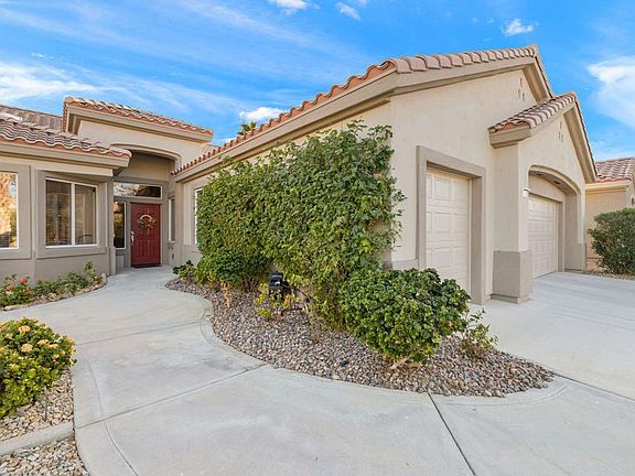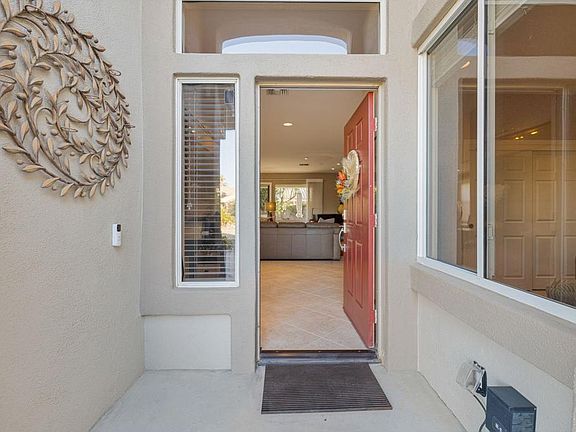 This beautifully remodeled open concept St. Croix has 3 bedrooms, 2 baths and sits on a corner lot, with the backyard facing south. The exterior was painted 4 years ago. It has 12X24 porcelain tile, 3 skylights, and a 2018 HVAC system. The kitchen has contemporary embossed laminate cabinets with custom pulls, newer high-end stainless appliances, wine fridge, island with quartz waterfall, glass tile backsplash and recessed lights. The living room and dining room have recessed lighting, beautiful fan/lights, and view the gorgeous, lush backyard. The large primary bedroom has newer carpet and a slider out to the backyard. The bathroom has a skylight, custom closet, fabulous remodeled shower, upgraded counters, sinks, and faucets. The guest bedroom has built-in cabinets and TV. 2nd bathroom has slab counters, new sink, tub with tile surround, and white cabinets. The large den/bedroom has new carpet, recessed lighting, a closet and is a perfect office or flex room. The laundry room has upper and lower cabinets with a folding counter, and includes the washer/dryer. The large backyard has an extended patio, with several sitting areas with high-end patio furniture, real grass, fruit trees, patio cover, and an open corner view. The extended 2-car garage has a golf cart garage, sink, cabinets, fridge, elect car charger, mini-split, water filter system, newer heat-pump water heater with recirc. pump. Turnkey furnishings available.