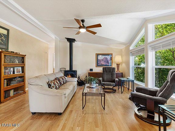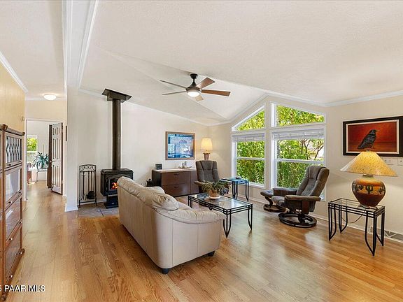 Like-new, IMMACULATE manufactured home in Prescott Valley's Unit 17 - once you see it, it's sure to be your next home! Upon entering the front door, you'll see a bright and open living space with large windows, high ceilings, crown moulding, laminate wood flooring, and a wood stove for cozy winter nights. The ''flow'' of this home just makes sense....splitting the two guest bedrooms (both with walk-in closets) and full guest bathroom and the primary living quarters (with huge closet and bathroom with a large garden tub). The kitchen is in perfect shape and is, again, so bright due to all the windows and skylights. White kitchen appliances are in perfect shape and have been updated as needed; an attached laundry room with a stackable washer/dryer off the kitchen completes the space.