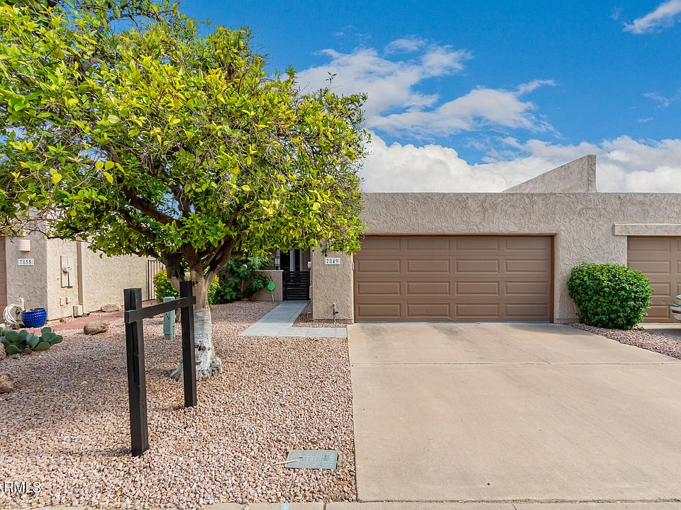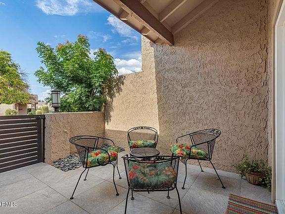 You will fall in love with this charming 2-bedroom, 2.5-bath townhome in Camelback Mountain View Estates! A 2-car garage & a private courtyard are just the beginning. Discover a perfectly flowing open layout showcasing a single step-down living room with a kiva fireplace! Fresh Interior paint, wood and wood-style flooring, recessed lighting, and vaulted ceilings with exposed beams enhanced the inviting ambiance. The kitchen boasts stainless appliances w/wine cooler, quartz counters, glass tile backsplash, built-in desk, and white shaker cabinetry. This gem comes with two large main bedrooms, each with a stylish barn door to their ensuite! One bedroom features a walk-in closet and French doors leading to the back. Need space for relaxing or grilling? The private backyard awaits with a covered patio and desert landscaping. The community pool, spa and mail boxes are situated directly across the street. This beautiful townhome is located near numerous restaurants, Scottsdale Fashion Square and Old Town Scottsdale. Perfect for year-round living, or as a great lock-and-leave. This beautiful townhome won't last long.