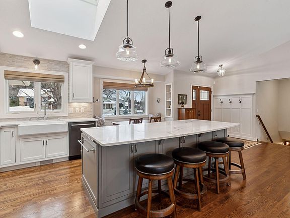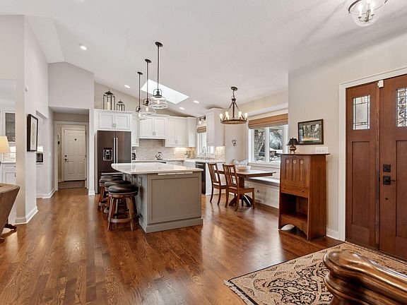 Welcome to this impeccably maintained home! Impressive curb appeal with paver driveway, knee high paver decorative wall, lush landscaping and elegant paver steps and walkway leading to the backyard. Take in sneak peek views of Fish Lake from the quality-constructed screen porch with maintenance free decking or from the decorative paver patio, complete with a seating wall and ornamental pillars. The gracious open floor plan boasts vaulted ceilings and a skylight for abundant natural light. The gourmet kitchen features a timeless backsplash, exterior-vented range hood, numerous pull-out shelves, soft-close hinges, and high-end black stainless appliances, including an induction cooktop, convection oven, and drawer microwave. The oversized island is perfect for meal prep or entertaining, complemented by a cozy built-in dinette bench with storage. The dining room offers a stunning hutch for both storage and display. The great room showcases a bay wall of windows with scenic year-round views and a floor-to-ceiling gas fireplace flanked by beautiful built-in cabinets. The primary suite offers spa-like bath with heated floors, dual sink vanity, step-in shower, and walk-in closet. Three bedrooms are conveniently located on the main level, with two additional bedrooms on the lower level. The lower level family room has heated floors and backyard access, plus a recreational space with a wet bar. The epoxied 2.5-car garage includes a floor drain, storage racks, and a tool organization unit. Additional highlights include solid wood floors, remote controlled blinds, gutter guards, newer furnace, AC, and windows to name just a few. All of this is situated on a quiet street with direct trail access!