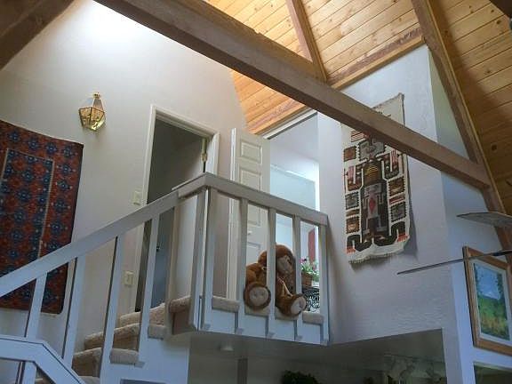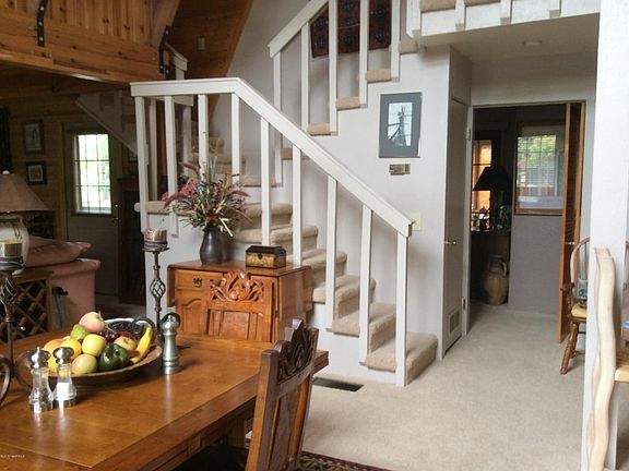 Extremely well kept A Frame with wrap around decking. Master bedroom on main level with bath and laundry room. Upstairs to an extra large loft bedroom with its own bath. At the top of the staircase is an additional bedroom with its own decking. This home is perfect for year round living. Two large bedrooms with an extremely large loft. Open floor plan. Decking on three sides. Furnished including a new refrigerator. You won't find landscaping anywhere in the area like this home.
