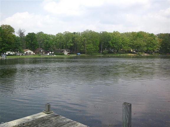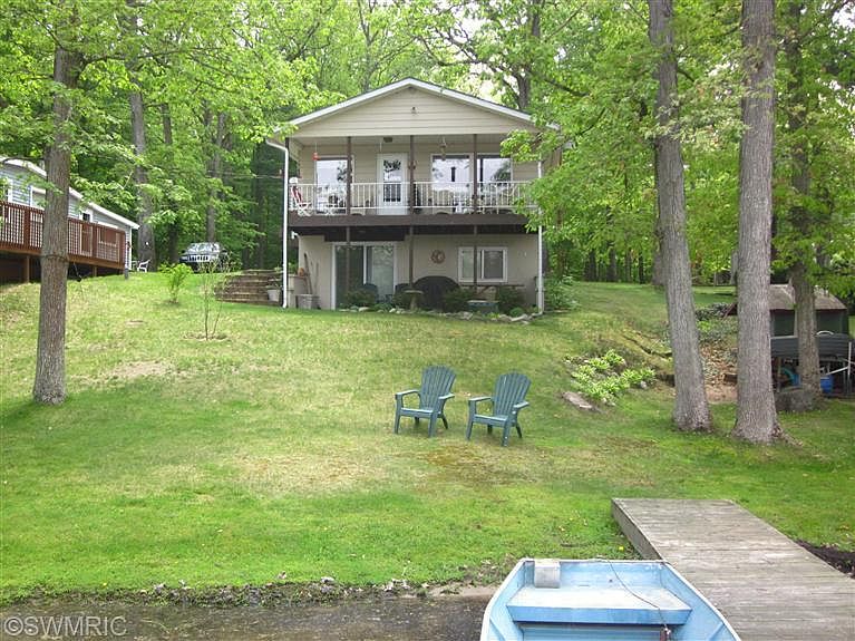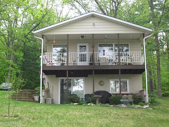 Half Moon Lake private frontage. Very well maintained home with a great view of the lake. Built in the 70's, this ranch style home(possible cottage) has 2 bedrooms, 1.5 baths, kitchen with eating area and living room overlooking the lake. The main floor has a covered deck. Walkout basement has a large family/rec room with a slider to a patio. Home is aluminum sided with aluminum soffits, extra large 1 stall garage with drive through doors and storage area. Half Moon Lake is all sports and owner says it has good fishing. Beach area at the shore line. Long driveway is shared with the neighbor. Only 1 hour from Lansing and/or Grand Rapids. Possession by July 1st.