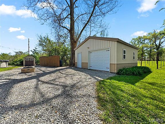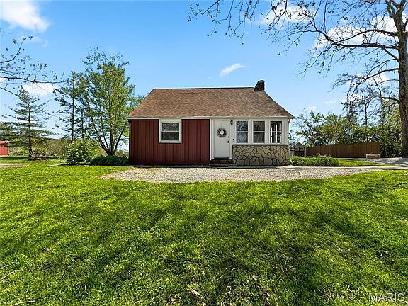 Fall in love with this 1200+ sq. ft. historic country cabin - the perfect embodiment of rural charm! Nestled in the bluffs above Columbia, this 2 bed (could be 3) 1 bath charmer has the best vibe! Main floor laundry. Open concept Living/Dining features wooden beams & non-functional original fireplace w/built in bookcases. Throwback kitchen w/new butcher block counters, new stove, antique cabinets & new accent wall. Fresh remodeled bath w/tub/shower combo. Primary bed w/new flooring walks out to your serene back yard patio complete w/paper birch, coy pond, young vineyard & a stunning view. Bonus room for your nursery, office or flex space? Huge additional bed upstairs w/built in dresser. Detached 5 yr. old 2 garage w/room for your toys. 2024 Kitchen remodel, LVP in bed, office & bath, new vanity, basement & cistern sump, pool liner & pump, new French drain E side of basement and central air. 2023 paint, Shed, Pond, driveway, Vineyard, Trees removed, new front landscaping. Adorable!