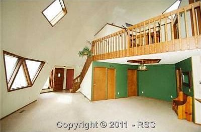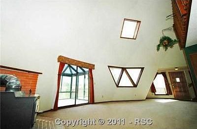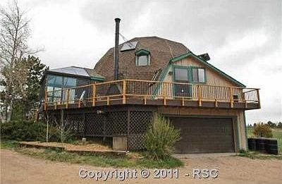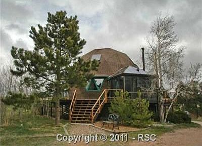 My home is a geodesic dome. The lot it is on is 5 acres and has views of Pikes Peak and many other mountains. The home has an attached garage and unfinished basement on the lowest level. The main level has 2 bedrooms 1 bathroom, kitchen, living area. Outside the living area is an attached sunroom which eliminates using natural gas heat on any sunny day. On either side of the sunroom are redwood decks. The top floor of the home has 2 bedrooms, 1 bathroom, an office, and circular landing. The home has 3 skylights, one of which open. There is a 700 sq ft workshop with power and lighting.