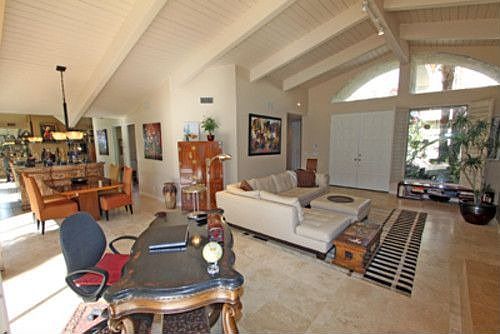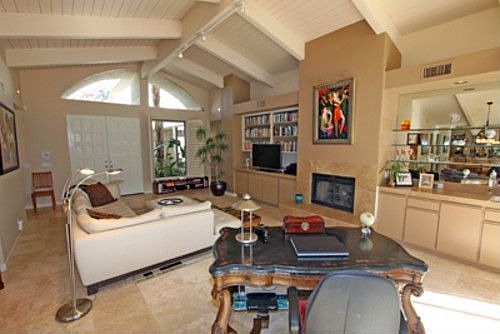 Tranquil, Lush, and Private Courtyard entry sets the tone for this lovely upgraded Mountain Cove condo with awesome mountain and golf course views! Full wall of glass sliders lead from Living Room and Dining Room out to private flagstone patio with outstanding south and west views. Travertine flooring is used throughout this 2110 SF home with 2 Spacious Bedrooms, 3 Baths, plus a large den/office (this could be converted to 3rd bedroom). Living Room with high ceilings and beautiful travertine fireplace, Wet bar with glass shelving, formal Dining Room, and Master Bedroom with privacy and magnificent views make this a special home at Mountain Cove in prestigious Indian Wells!
