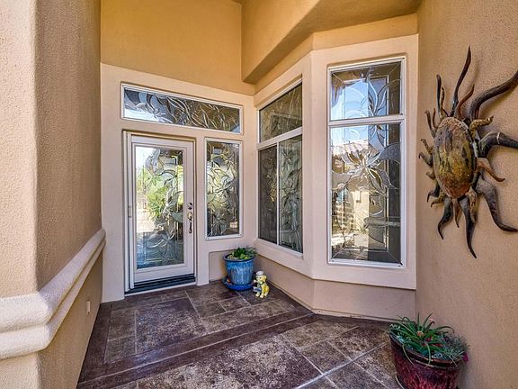 Experience luxury living in this stunning home located in the highly sought-after Sun City Palm Desert. This outstanding location offers panoramic golf course and mountain views and is situated between the Lakeview & Sunset View Clubhouses. This home offers an open floor plan providing a spacious, elegant environment with 10' ceilings, automatic blinds, stacked tile fireplace wall, new ceiling fans, new ceramic tile flooring throughout & carpet in bedrooms. The property is always light & bright with striking lead glass windows in the foyer & kitchen. The great room opens to a den with custom-built display cabinets & desk. A separate casita offers privacy & comfort for guests featuring a wet bar, new refrigerator, granite counters, & customized closet. The immaculate open kitchen features a one-of-a-kind service bar with glass shelving, wine refrigerator, spacious center island, stainless appliances & quartz countertops. Master suite features a bay window with automatic blinds & custom walk-in closet. Remodeled bath includes a specially designed vanity with quartz countertop & walk-in shower with a rimless glass enclosure. Bedroom 2 includes multi-use built-in desk and cabinets/shelving. The south facing rear yard is perfect for entertaining with a covered patio, refreshing saltwater pebble tec pool & spa. The property includes a convenient inside laundry room with a sink & offers access to the 2-car garage with a nook for golf cart parking & custom storage lift. in ceiling.