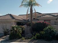 Sun City Palm Desert Baccarat. Located on a corner lot just a short walk to the Mountain View clubhouse this home has a South facing rear yard with an extended salt finished patio and alumawood cover. There is curb appeal in front with a salt finished walkway leads to a gated courtyard and double door entry. Inside, there is tile in all but the living and bedrooms. A foyer with 12' coffered ceiling leads to the living room with a slider to the rear yard. The kitchen has corian counters, a b...