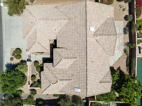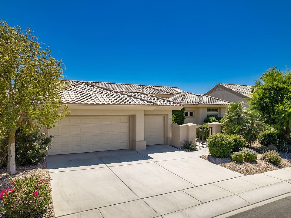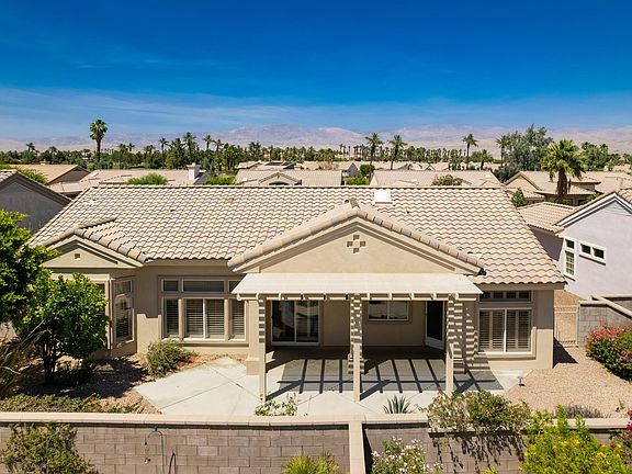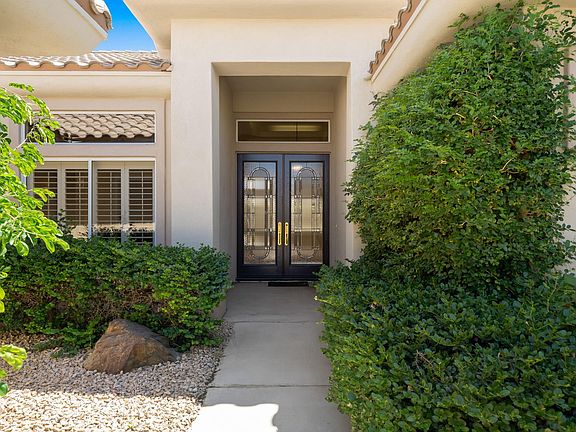 This popular Emerald model has a very private south facing backyard. This newly painted home has a fabulous formal living/dining room with double leaded entry door and glass sliding doors, that view the desert landscaped backyard. The plantation shutters and skylights make it bright and cheery. Just off the large kitchen is a cozy open family room and breakfast area. The primary suite has a bay window walk-in closet, a double vanity, shower and a soaking tub. The guest suite has a private full bathroom with a shower tub combination. The den/office/third bedroom, has a half bath, also used as a powder bath. The large, south facing backyard has an extended patio with an Alumawood cover, desert landscaping, fruit trees and high walls for full privacy. The garage has epoxy floors, a golf cart garage and plenty of storage.