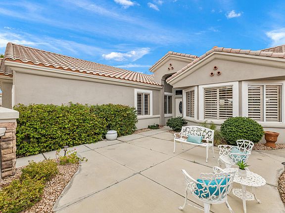 55+ Del Webb Sun City Palm Desert. Located on the 15th fairway of the San Gorgonio Golf Course with Stunning SOUTH mountain views. This very popular St. Croix model features 2 bedrooms, 2 baths, plus spacious den and additional hobby room/office. Nice curb appeal with fresh exterior paint, stacked stone details, gated courtyard with extended patio with sitting area to enjoy your morning coffee. Inside, new entry door with glass insert, 20 inch diagonal tile throughout, freshly painted with 5 inch baseboards, plantation shutters t/o, new HVAC in 2018, new water softener in 2022, new ceiling fans/lights, and central vac. Spacious kitchen has center island, breakfast nook with a view, new stainless appliances, custom backsplash, new faucets, reverse osmosis water filtering system and water softener. Great room and dining area have beautiful new vinyl picture windows with electric roll down shades, recessed lighting. Master suite with sliding door to patio, custom extra closet. New faucet/shower head and new toilets in both baths. The den and hobby room are off the living room with a pocket door inbetween and an access door to garage. Laundry room inside. 2 car plus golf cart garage. The extended patio has Alumawood awning, built-in BBQ, incredible views, and perfect for relaxing and entertaining! Come enjoy the lifesyle with (2) 18-hole golf courses, softball, tennis, pickleball, 75+ social and art clubs, and restaurants. ''Buy where you love to play...Sun City Palm Desert!