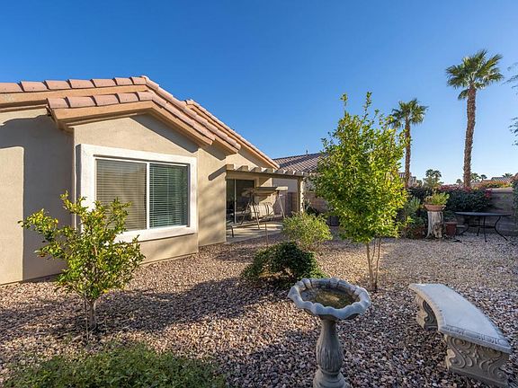 Sun City Palm Desert - Newport. Located around the corner from the neighborhood pool and not far from golf cart gate to the Stater Bros shopping center, this great room home has a spacious south facing yard with desert landscaping, citrus and peek-a-boo mountain views. Inside, vinyl plank flooring is used extensively and provides a contemporary palate. The greatroom has a slider to the rear patio that allows abundant natural light. The kitchen has corian counters, and a corner window that provides views of the Shadow Mountains. The primary suite has a window seat and good sized walk-in closet .The primary suite bathroom has a stall shower. A shower/tub is in the guest bathroom. The 2 car garage has room for ample storage.